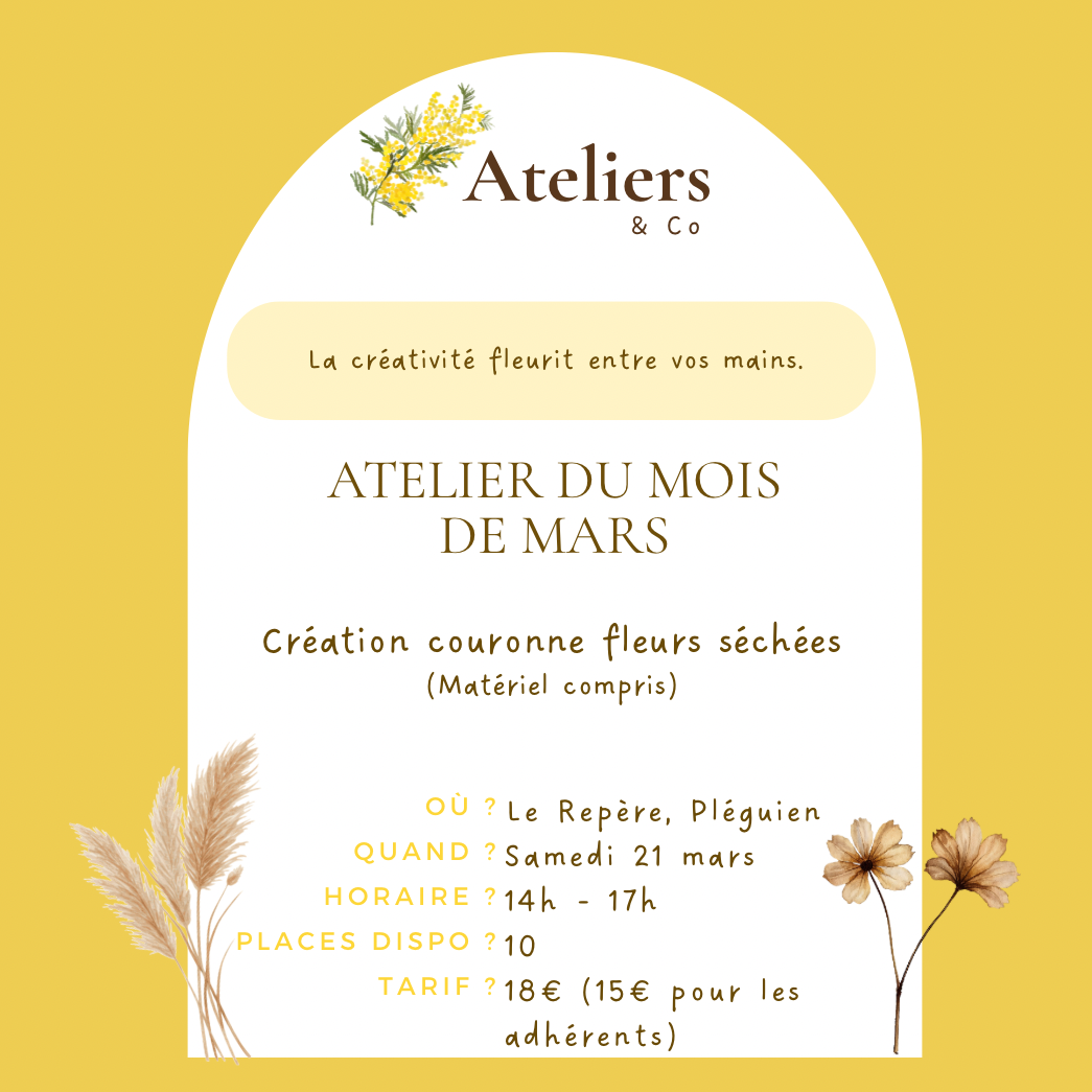 L’association Ateliers & Co propose un atelier de création de couronne de fleurs séchées le samedi 21 mars de 14h à 17h au Repère. Une fois par mois, l’association propose un atelier ouvert à tous pour vous faire découvrir un loisir créatif. La matéreil est fourni par l'association.