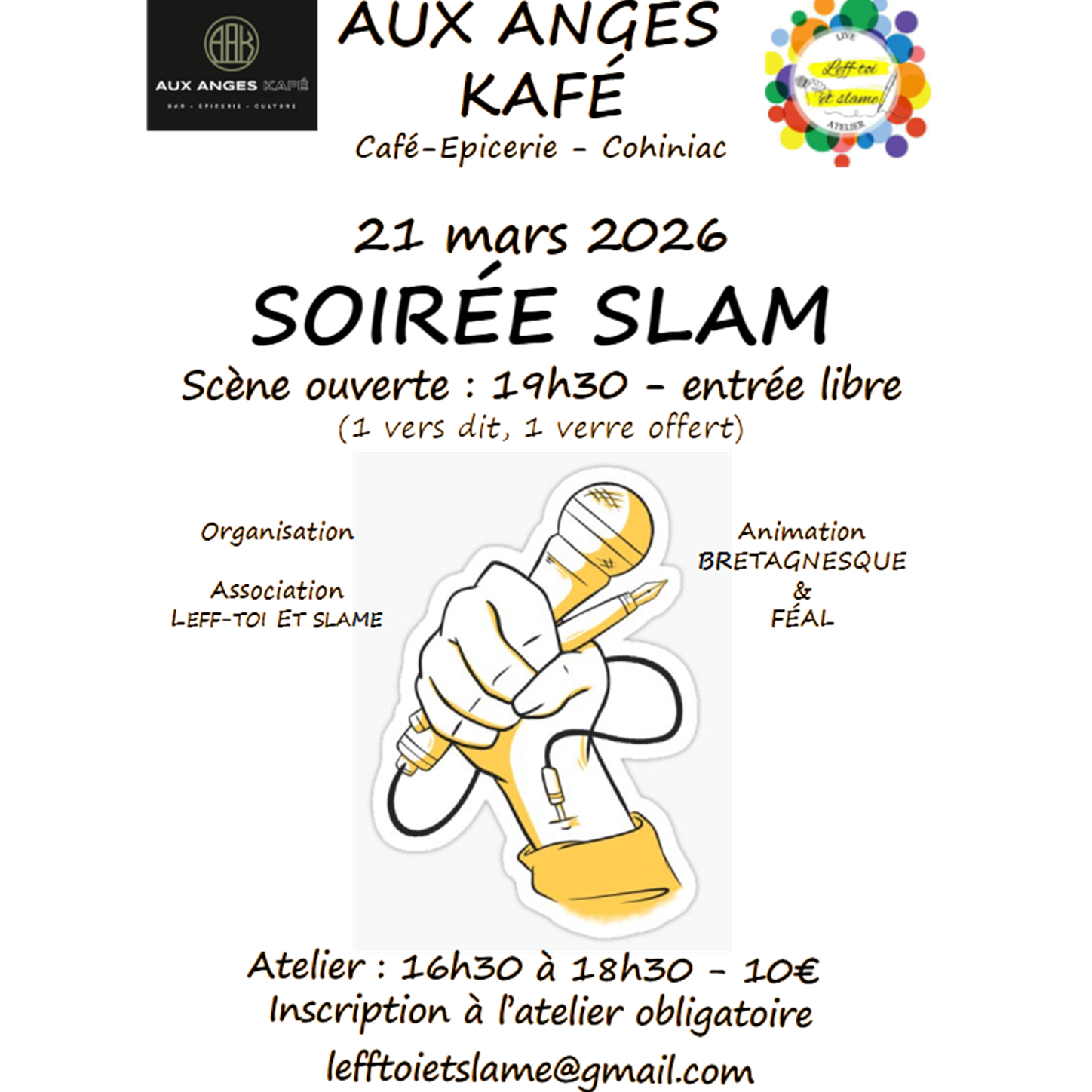 Notre scène slam est de retour ! Retrouvez l'association Leff toi et slame le samedi 21 mars 2026 aux Anges Kafé, Rue de la Poste de Cohiniac. Au programme :