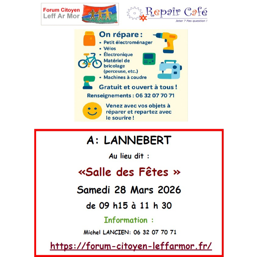 L'association "Forum Citoyen Leff Ar Mor" organise un atelier Repair Café à Lannebert le samedi 28 mas 2026 de 9h15 à 11h30, à la salle des fêtes.